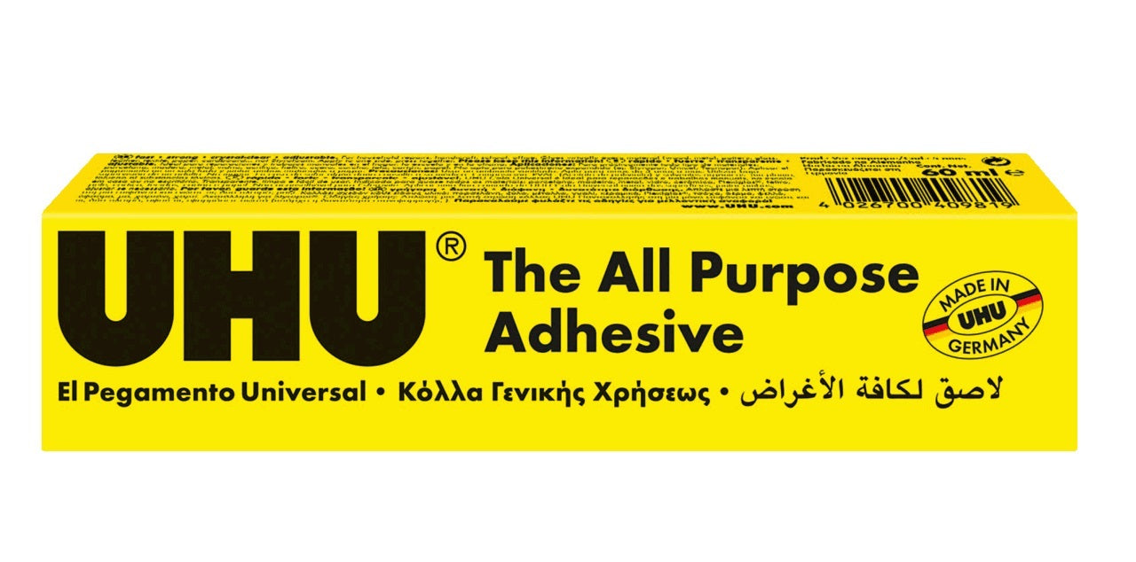 UHU All Purpose Clear Adhesive, the proven fast, crystal-clear universal adhesive. For universal applications at home, in the office, for modelling, at school and for crafts. Glues many materials rapidly and durably. Its adhesive bond remains temporarily correctable and it does not wrinkle paper. Supplied in 60ml tube. For use with, wood, wood based materials, plastics (ABS, hard- and soft pvc, Plexiglas, polystyrene, Resopal¨), metal, glass, porcelain, ceramic, leather, rubber, felt, cork, fabrics, cardboard, paper. Not suitable for polyethylene (polythene), polystyrene or polypropylene.