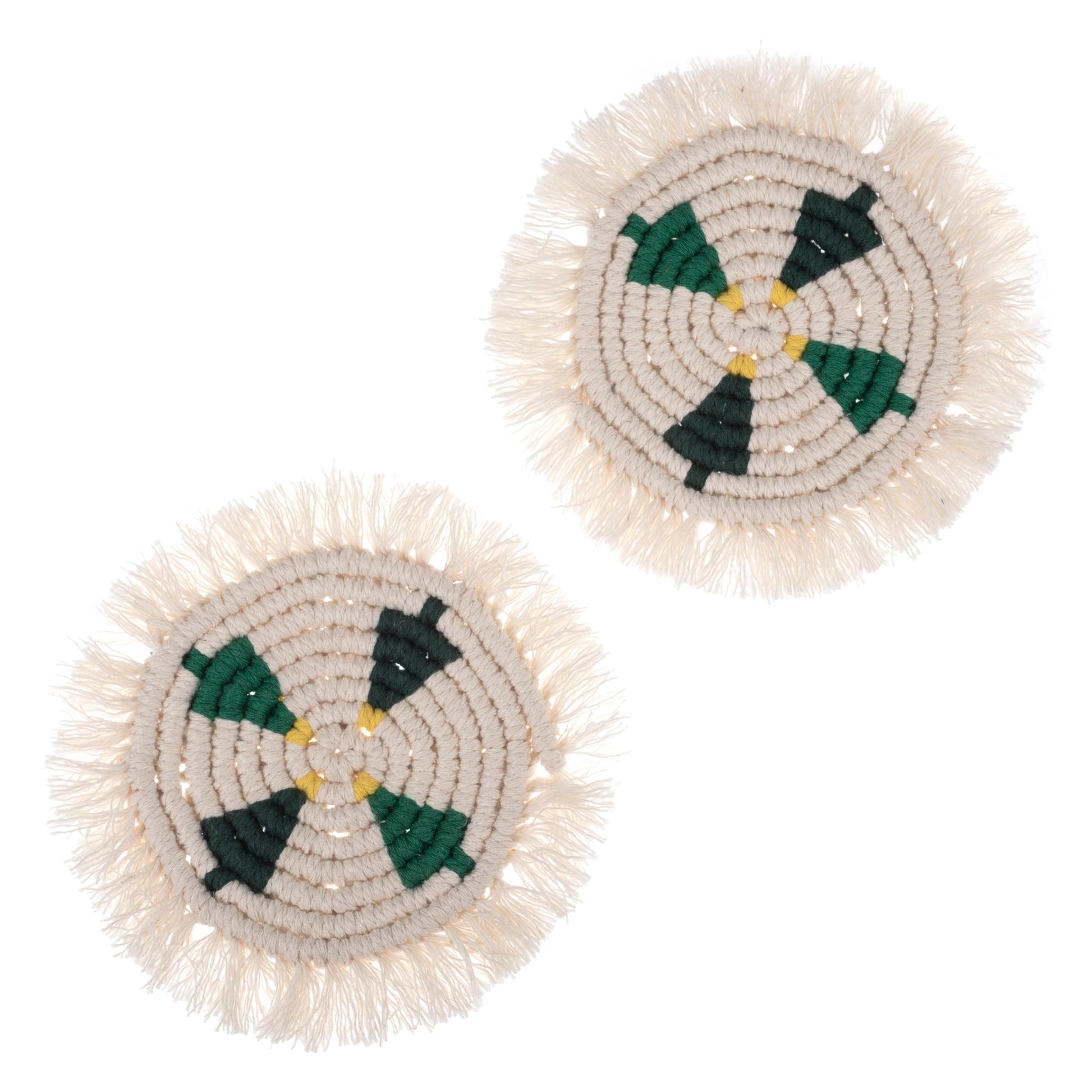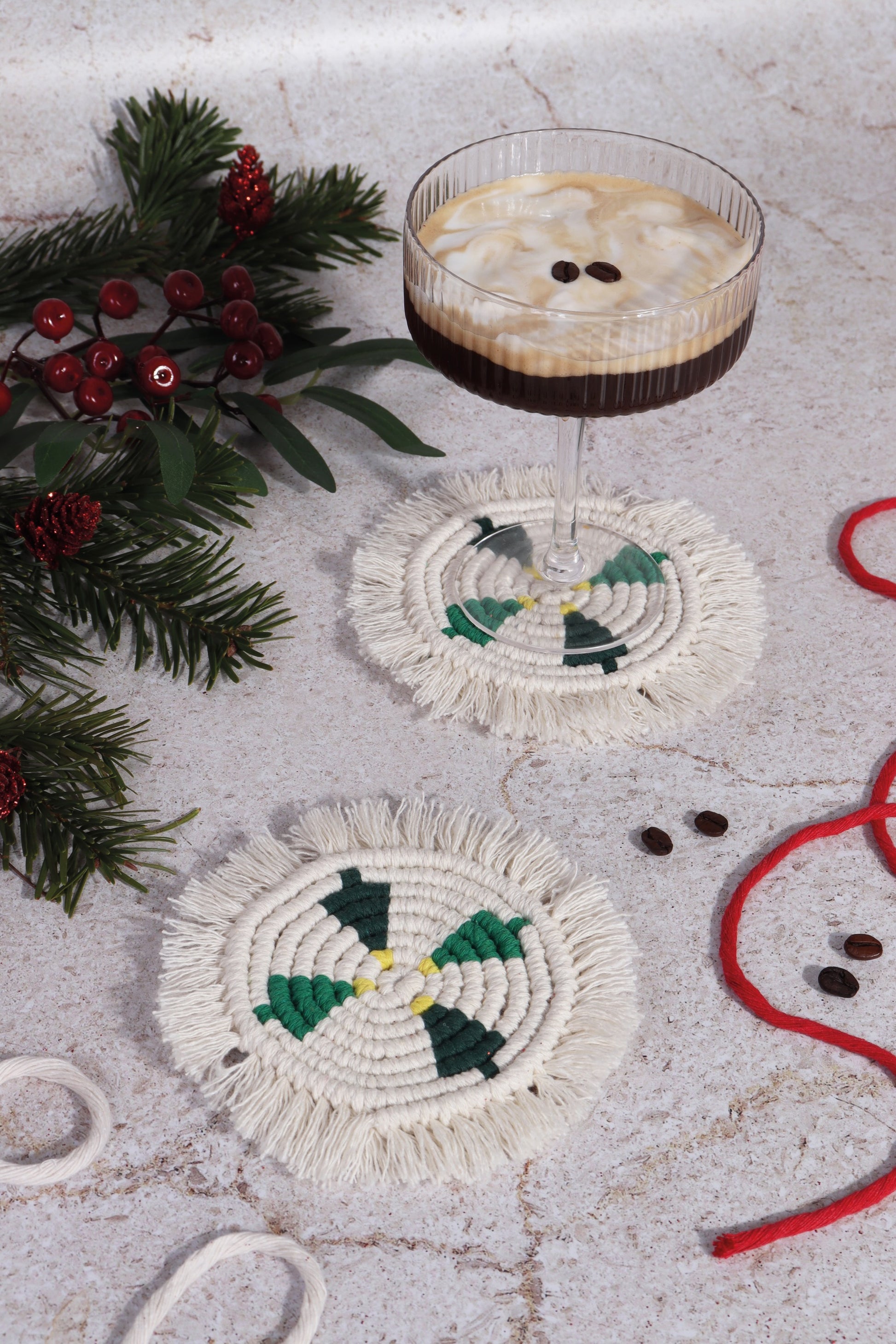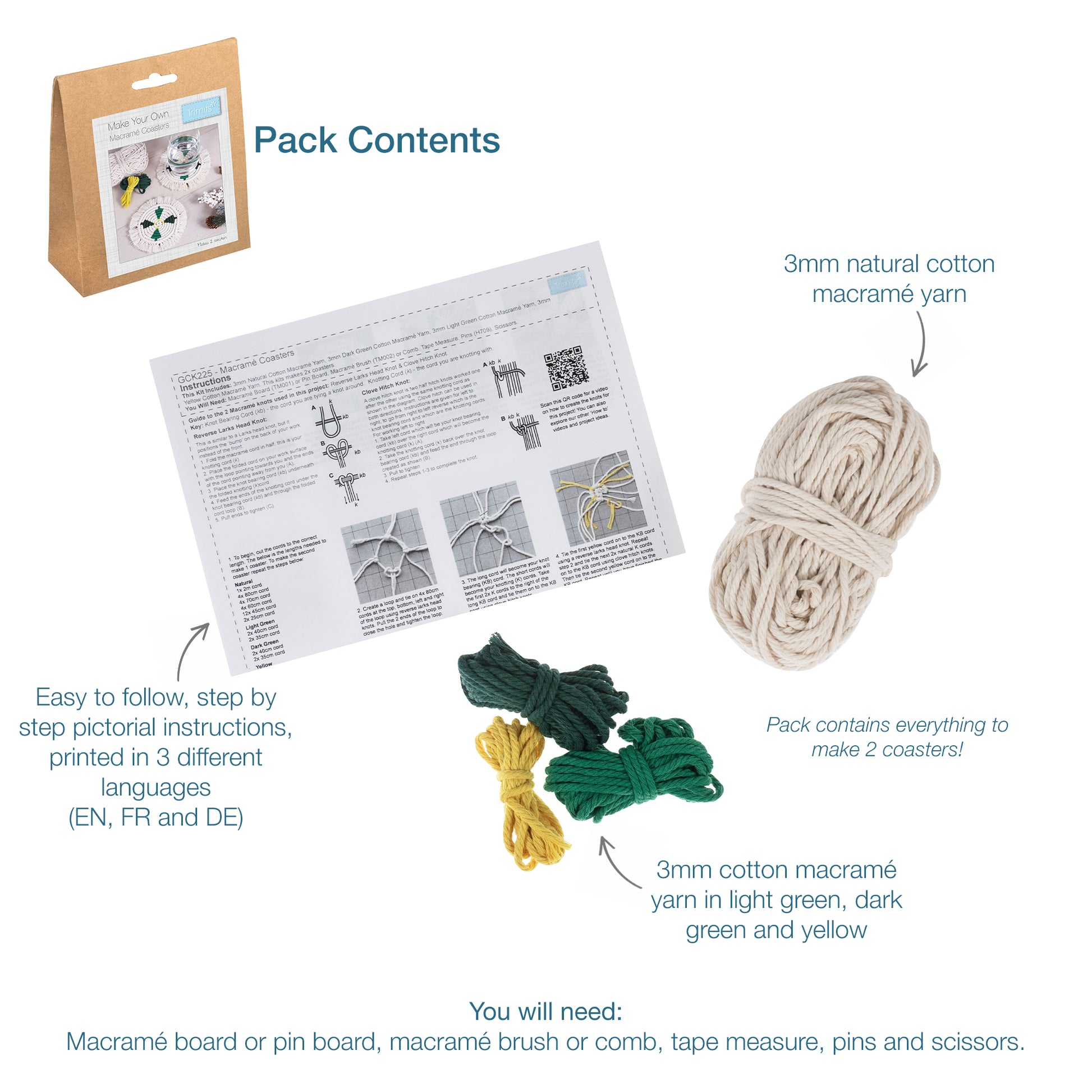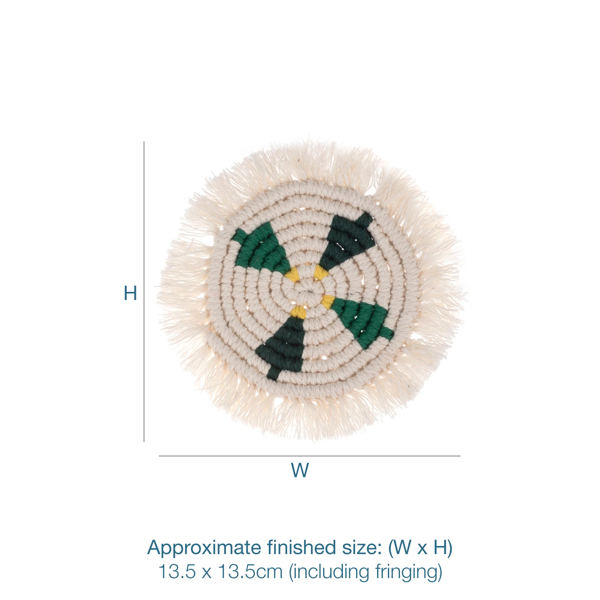 Coaster with tree design macramŽ kit to make 2 coasters. These kits are the perfect introduction to the art of MacramŽ. Kit includes: 4mm natural cotton MacramŽ yarn; 4mm dark green cotton MacramŽ yarn; 4mm emerald cotton MacramŽ yarn, 4mm mustard cotton MacramŽ yarn and instructions. You will need: MacramŽ board or pin board; tape measure; pins, scissors and a comb or macrame brush. Approximate finished size of each coaster: (d/w/h) 0.8 x 13.5 x 13.5cm (including fringing). (d/w/h) 0.8 x 9.5 x 9.5cm (not including fringing). Do not wash.