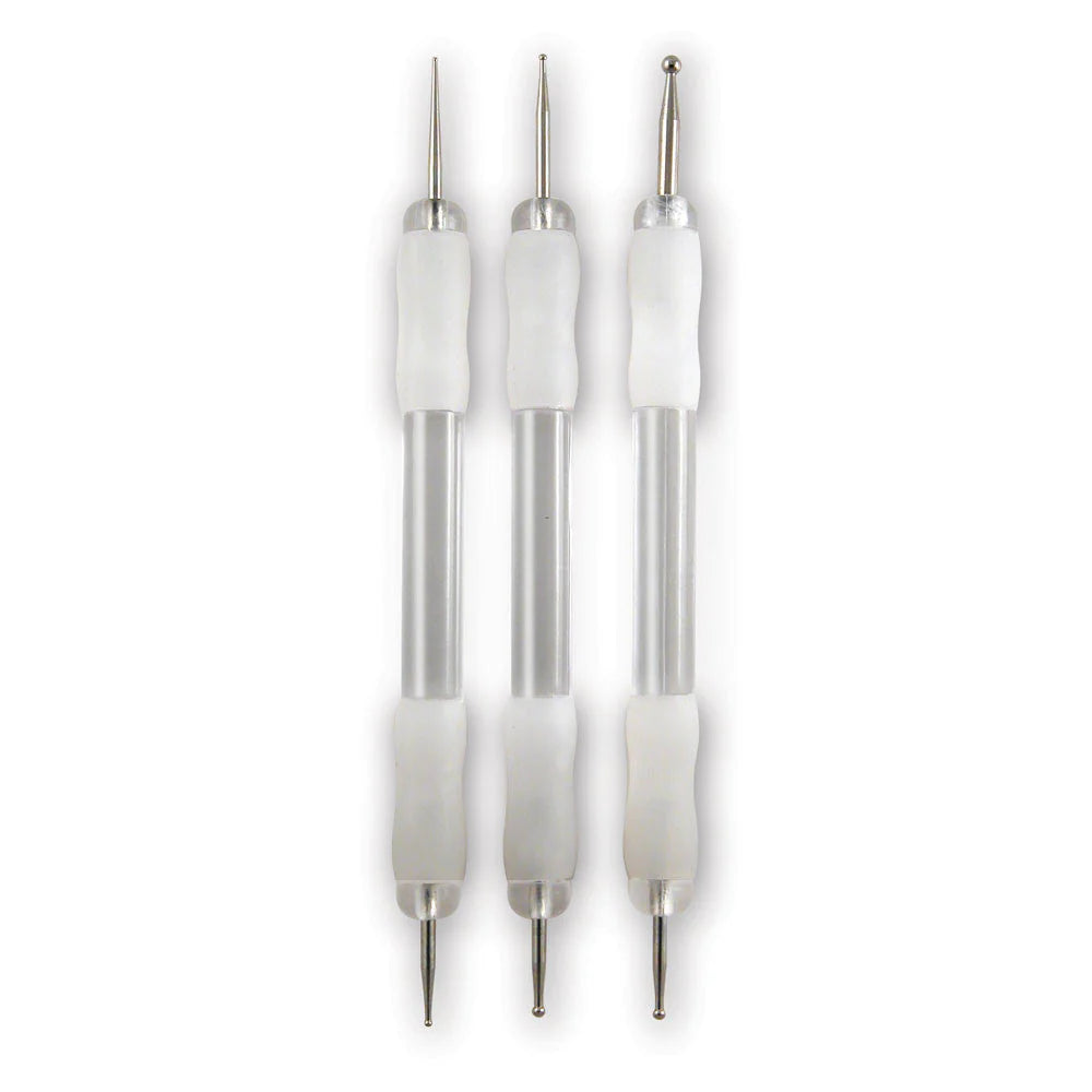 Embossing tools with Soft Grip Handles with a variety of small ball ends. Suitable for paper, card, thin metal, etc. Set of 3 double ended tools.