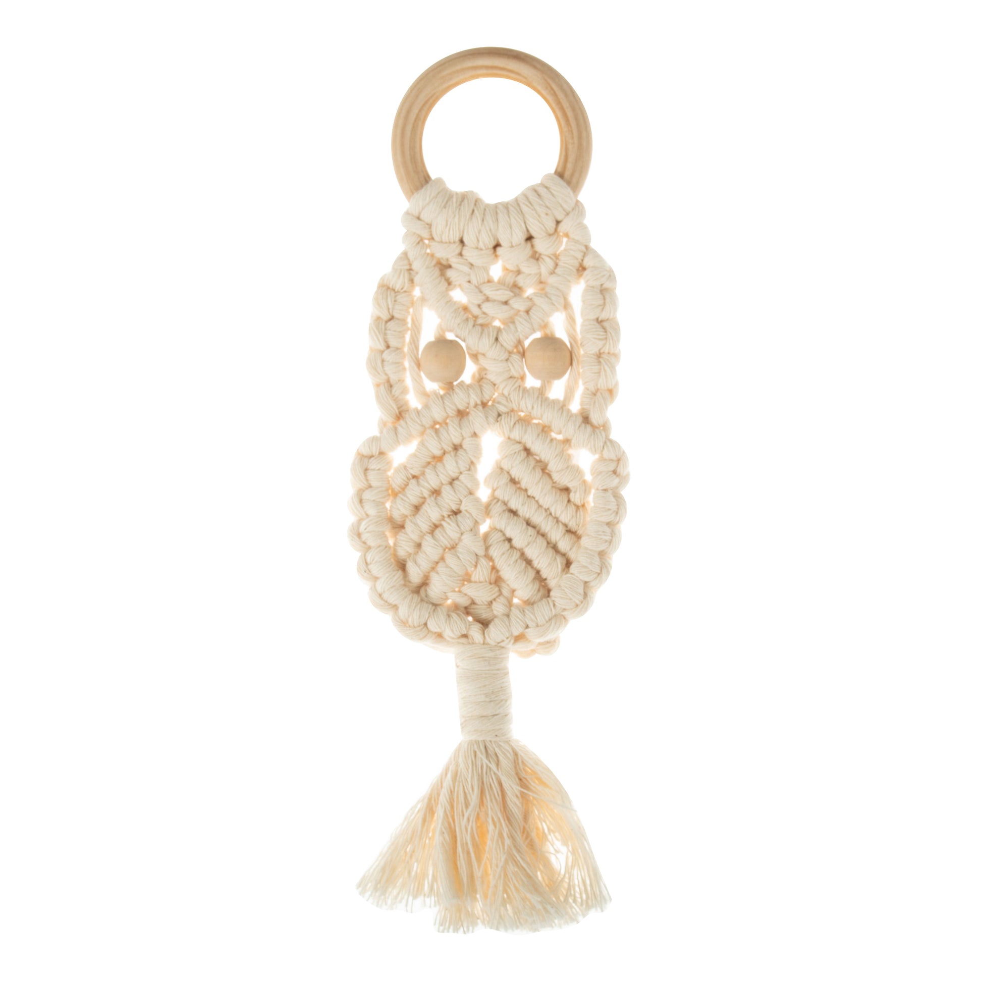Angel macramé kit. These kits are the perfect introduction to the art of Macramé. Kit includes: 8m of natural coloured 4mm, cotton Macramé yarn; 30cm gold thread; 5cm wooden craft ring; 20mm wooden bead and instructions in three languages (EN, FR, GER). You will need: Macramé board or pin board; tape measure; pins and scissors. Approximate finished size: (w/h) 19.5 x 18.5cm.