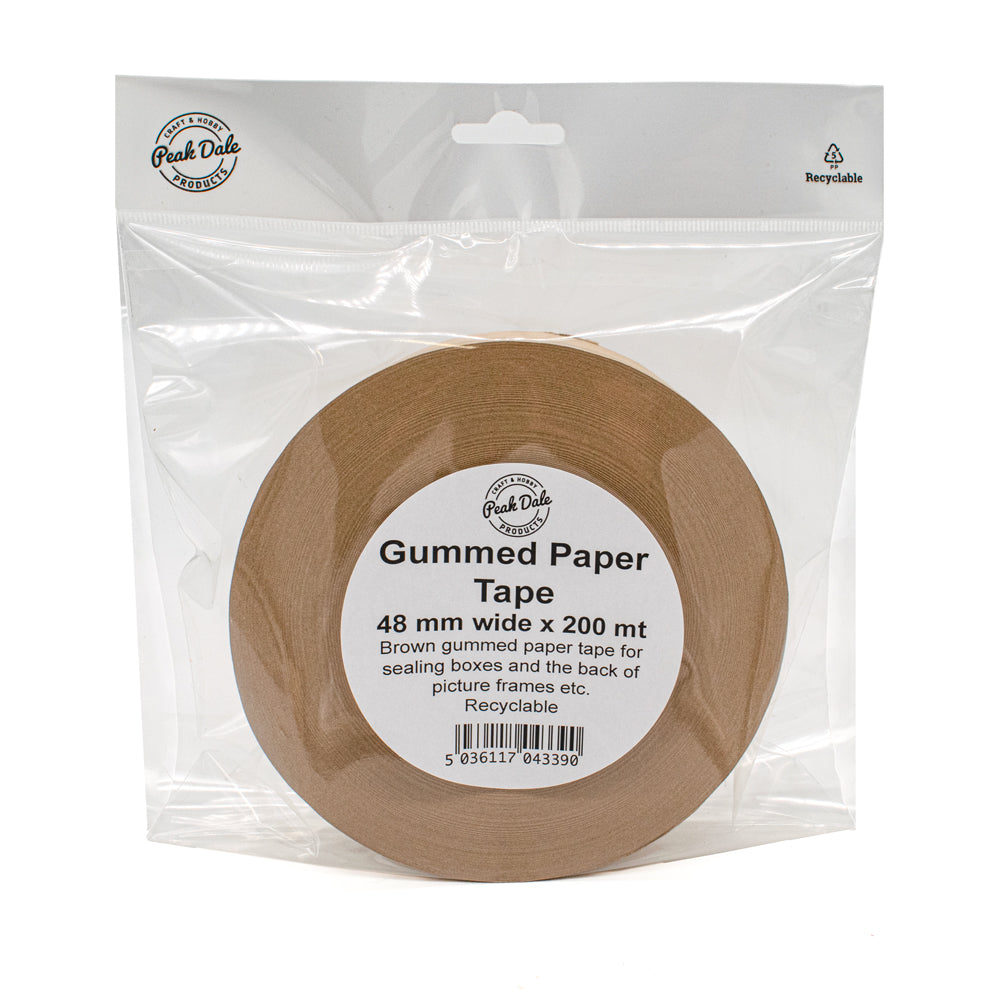 This 48mm wide x 200m long roll of gummed brown paper tape is ideal for sealing the backs of picture frames, securing cardboard boxes, or finishing off craft and DIY projects with a clean, professional touch.