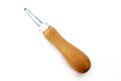 A special tool with a large hook for making rugs where the material has to be pulled through the hessian. The length of the whole tool including the handle is 139-140mm.